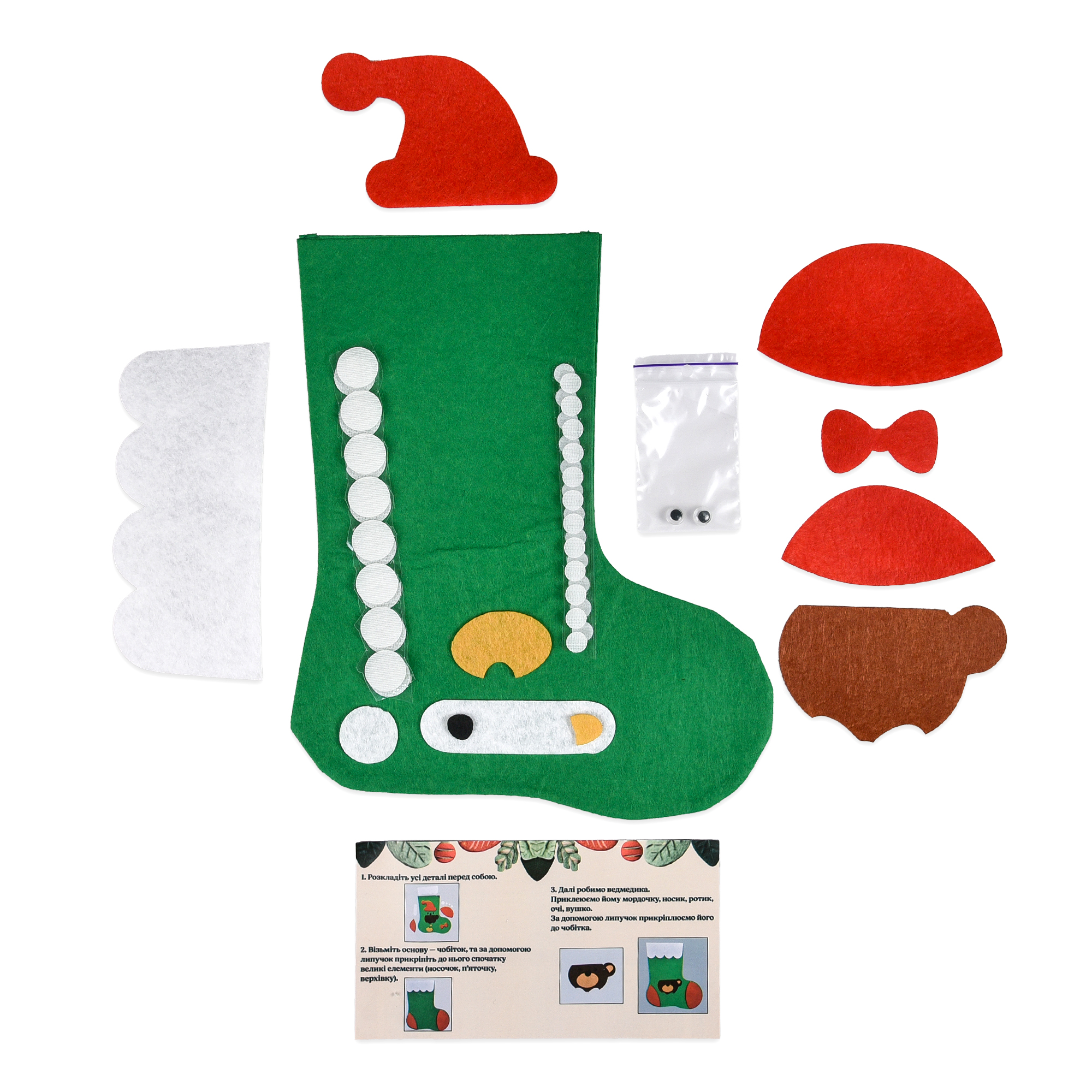 A festive craft kit that allows your child to create a bright Christmas boot from soft felt details and decorate it. Your child will develop their imagination, fine motor skills, and experience the true magic of the winter holidays. The finished boot can be filled with sweets or gifts and used to decorate a room or Christmas tree.