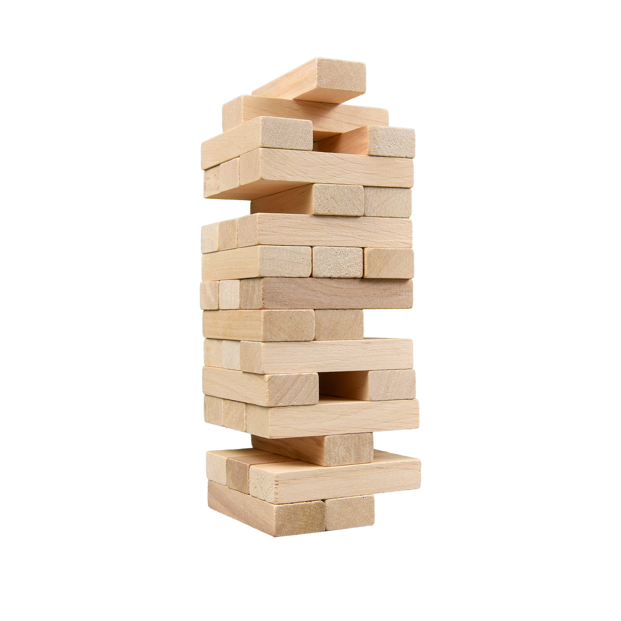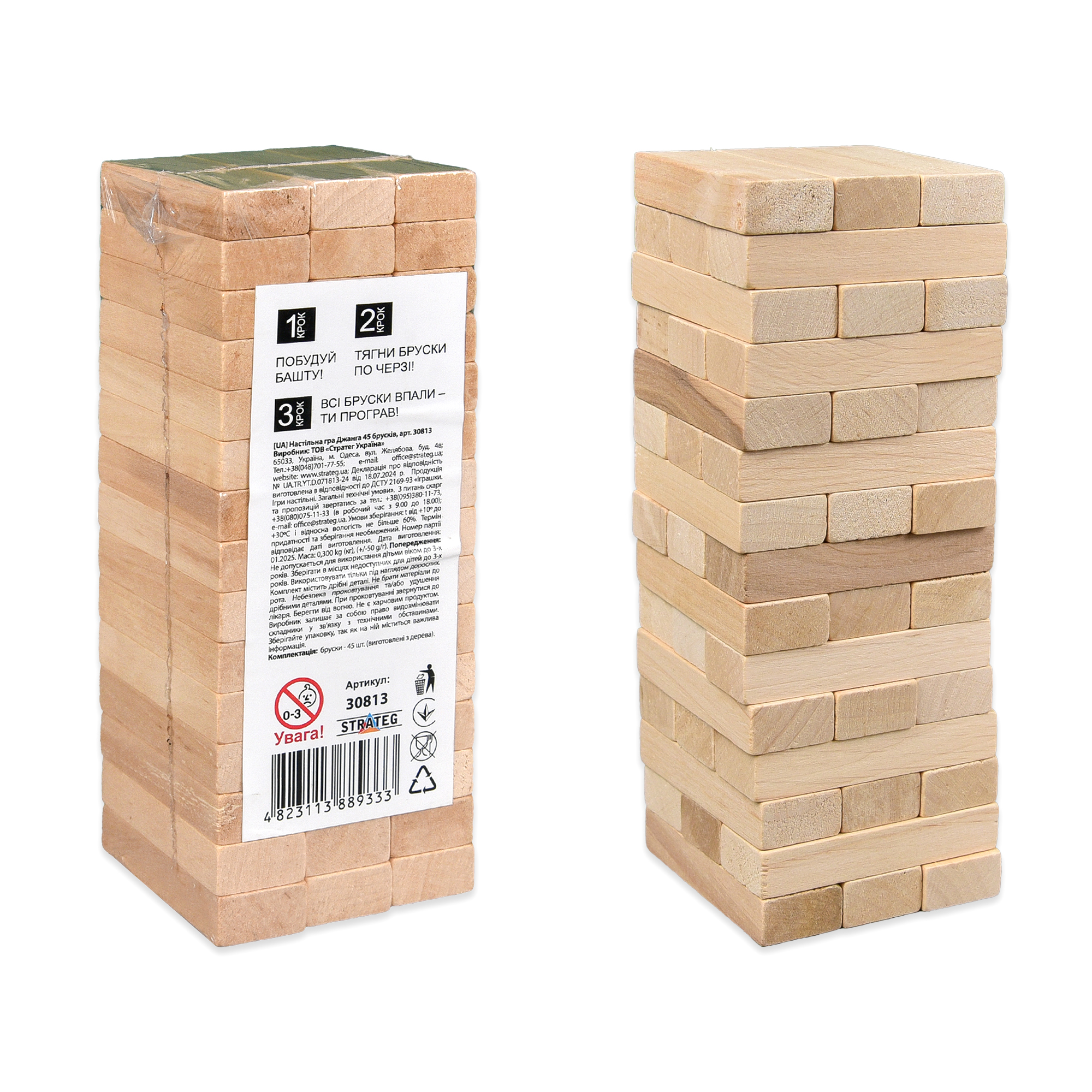 «Джанга 45 брусков» — классическая игра на ловкость и выдержку. Игроки поочередно вытаскивают бруски из башни и ставят их вверх, стараясь не разрушить конструкцию.