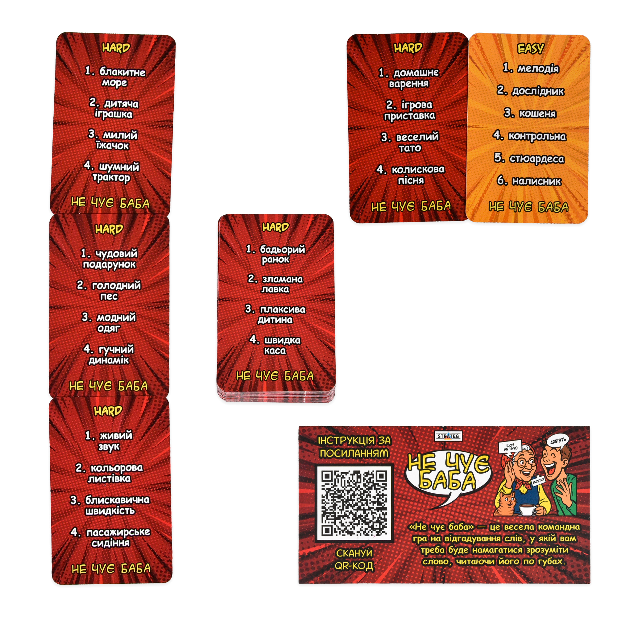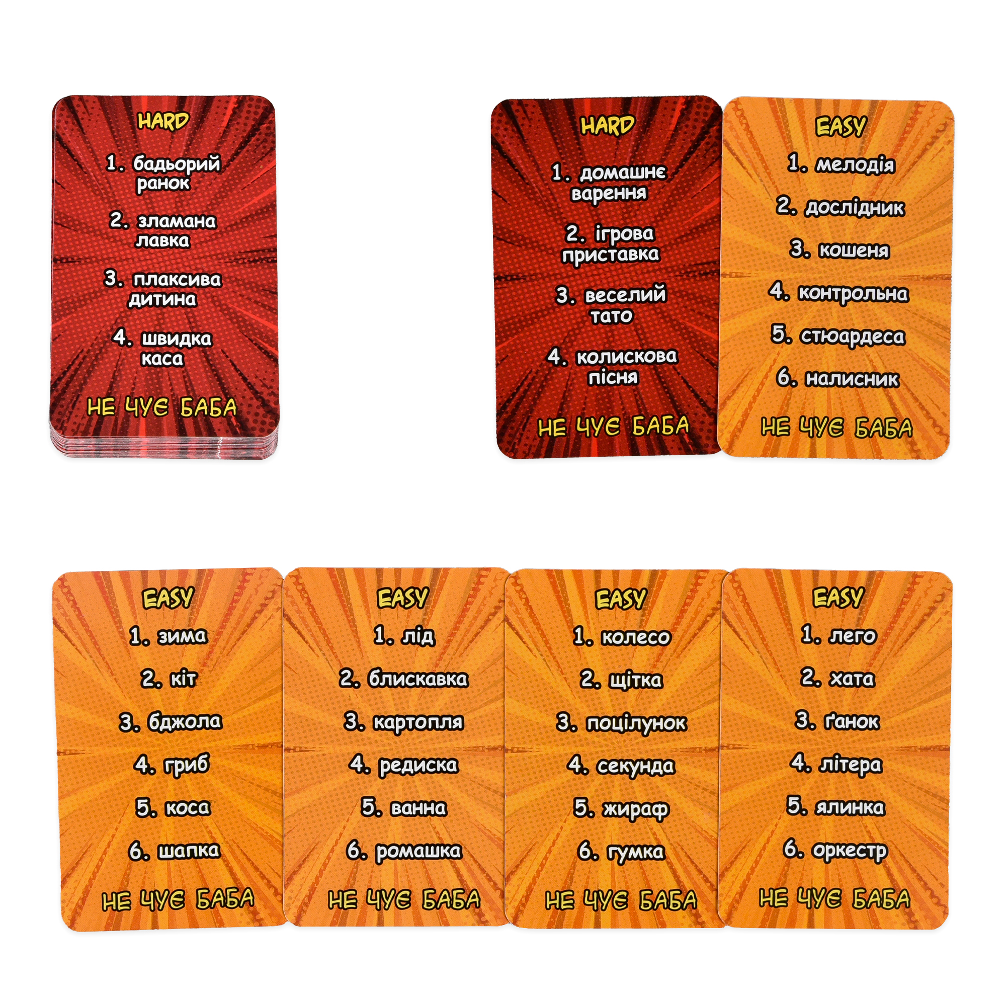 Игроки вытаскивают карточки с заданиями для «бабы». Но есть подвох: «баба» ничего «не слышит» — поэтому должно показать все только жестами, мимикой или забавными действиями.