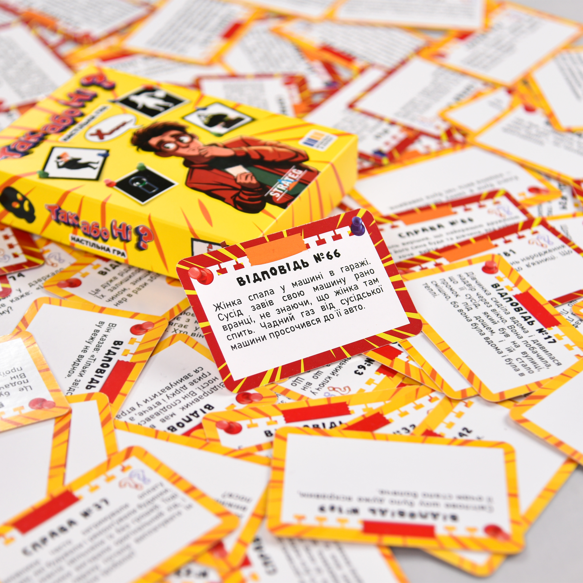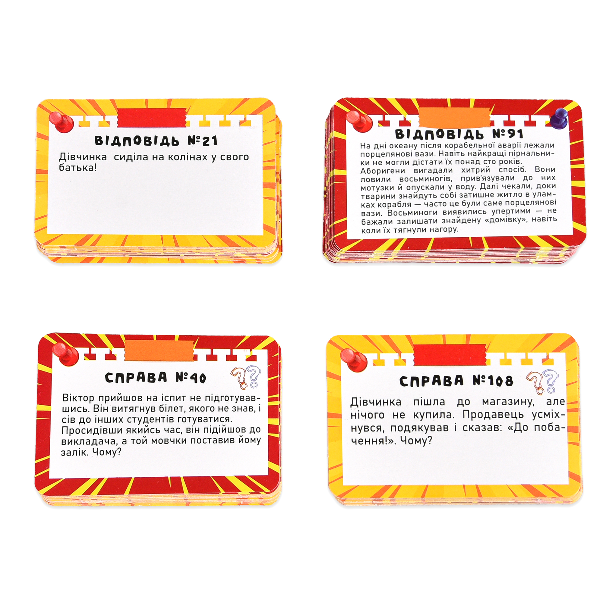 Один из игроков зачитывает загадку с карты, а остальные участники становятся детективами, которые пытаются восстановить полную картину события. Путь к истине лежит через правильные вопросы, на которые можно отвечать только да или нет.