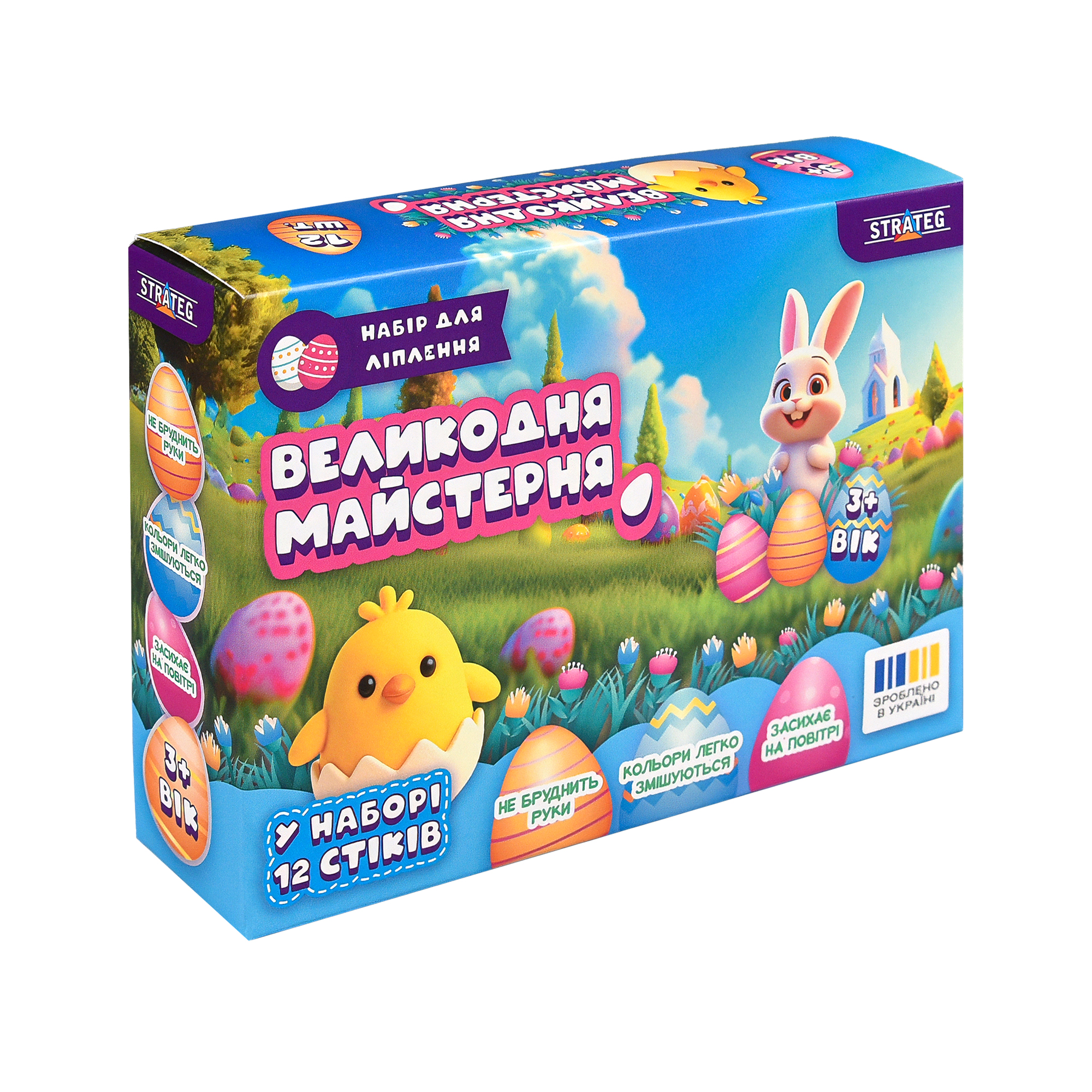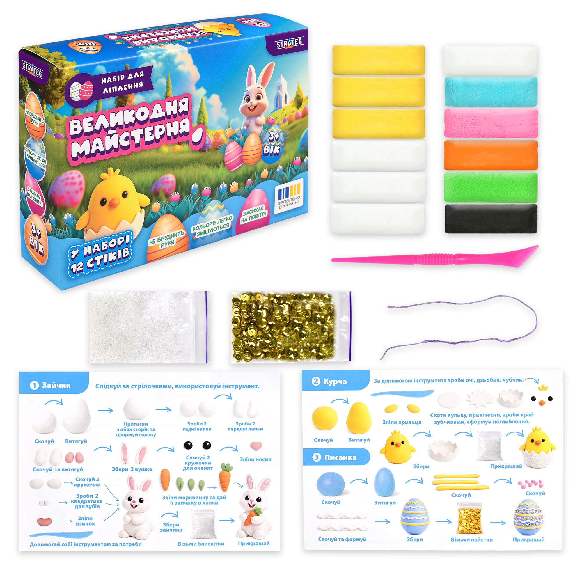 Напередодні Великодня особливо приємно створювати святкові прикраси власноруч. Набір для ліплення «Великодня майстерня» допоможе дитині легко зануритися в творчість і створити яскраві великодні фігурки з повітряного пластиліну. У наборі є 12 стіків м’якого пластиліну, інструмент для ліплення, декоративні елементи та зрозуміла покрокова інструкція. За підказками дитина зможе зліпити милого зайчика, курчатко й святкову писанку, а також створити власні фігурки та прикраси. Повітряний пластилін приємний на дотик, не бруднить руки й легко змішується, створюючи нові кольори. Після висихання вироби стають легкими та міцними, тому ними можна прикрасити кімнату або подарувати близьким до свята.