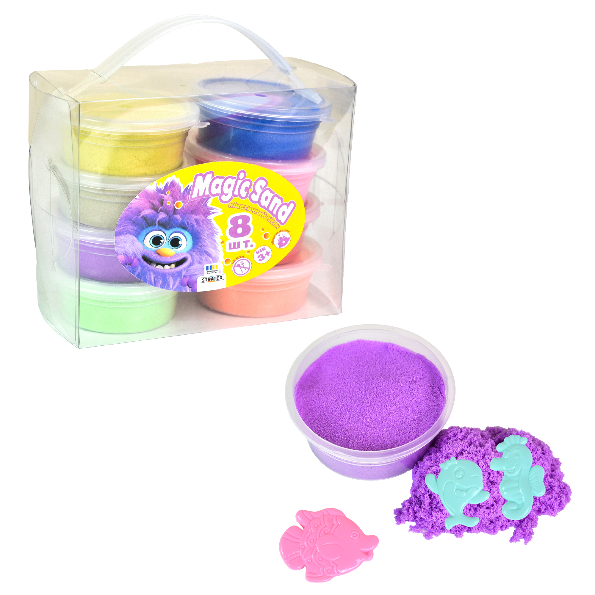 Magic Sand (Магічний пісок) - це набір, який містить 8 штук кінетичного піску різних кольорів. Набір упакований у прозору пластикову коробку з ручкою для зручного перенесення.