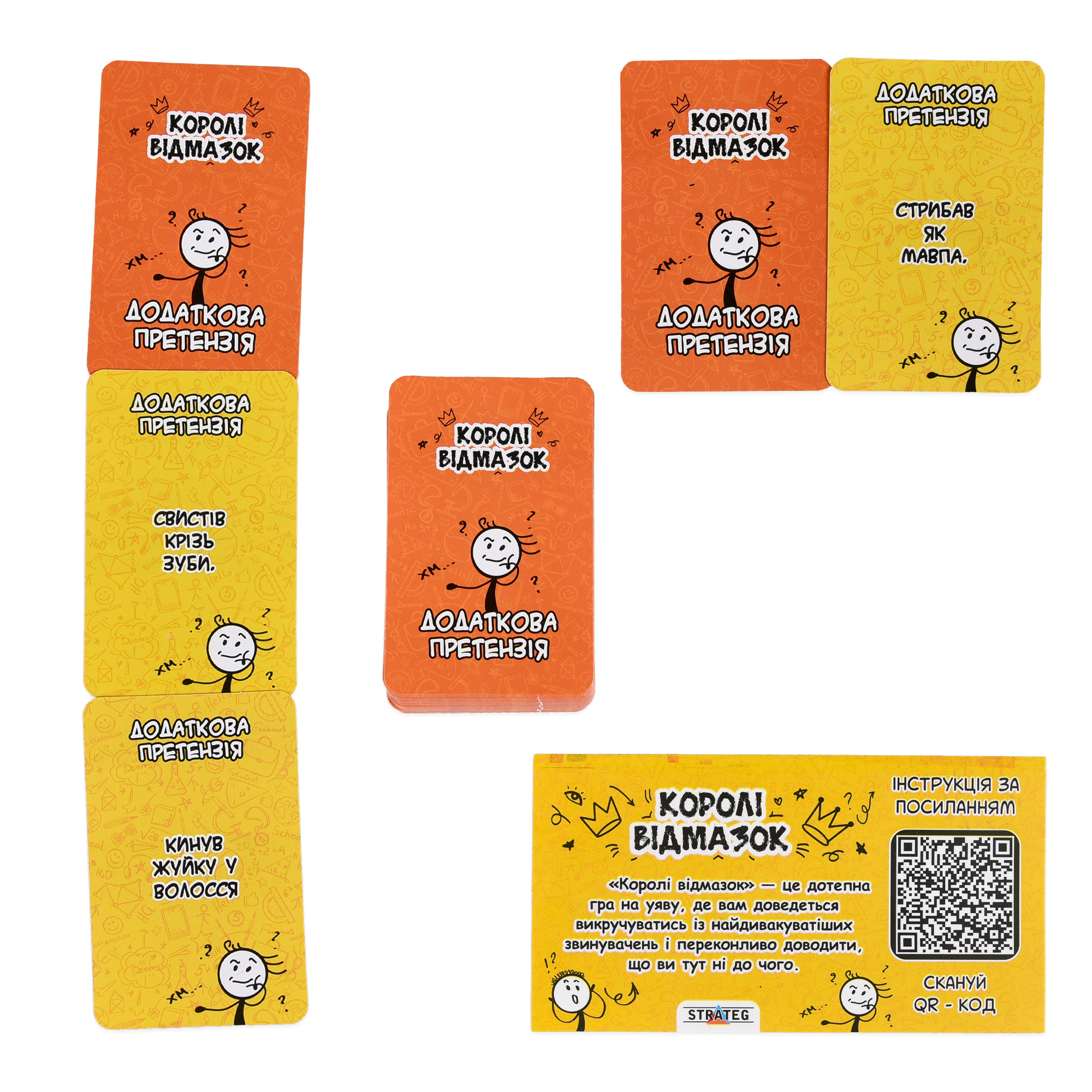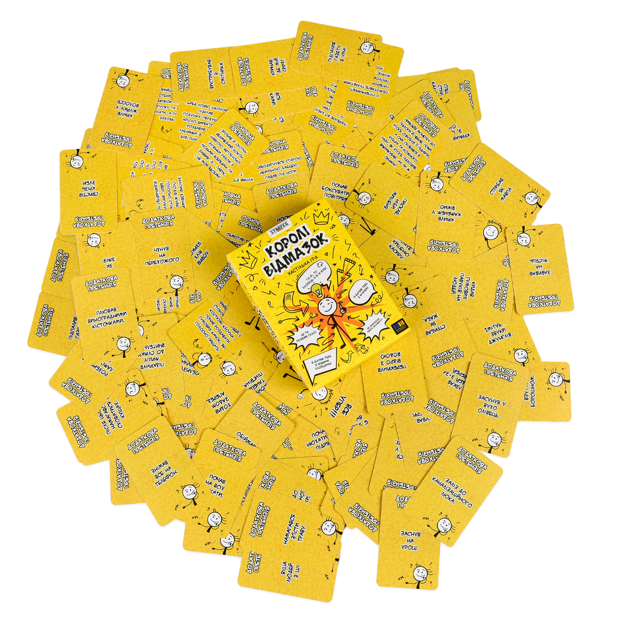 «Королі відмазок» — це настільна гра, що перетворює звичайний вечір на справжнє шоу сміху й креативу. Ти отримуєш картку з кумедною ситуацією та маєш вигадати найкращу відмазку. Чим абсурдніше й смішніше — тим веселіше всій компанії. Тут немає переможених, адже головний приз — вибуховий настрій і жарти, які ще довго згадуватимуть. Ідеально підходить для вечірок, посиденьок із друзями чи сімейних зустрічей.