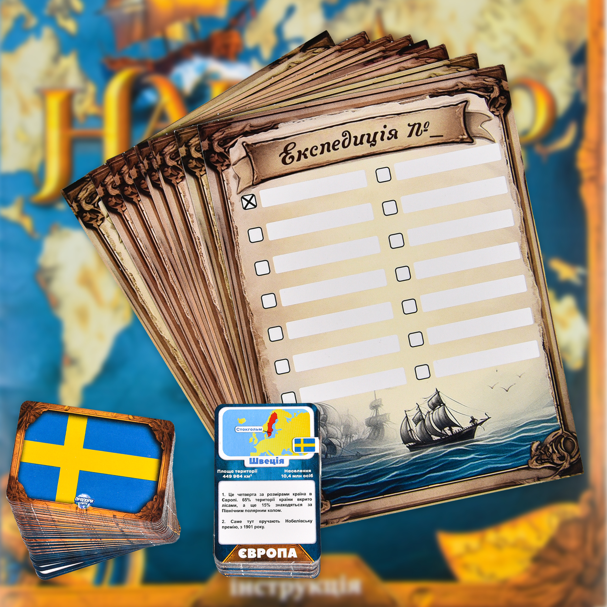 Комплектація: коробка (виготовлена з картону), ігрове поле — 1 шт., кубик, фішки — 4 шт., інструкція, рулетка, призові жетони — 75 шт., навігаційні карти — 4 шт., картки «Вантаж» — 56 шт., експедиційні листи — 8 шт., картки «Прапори світу» — 110 шт.